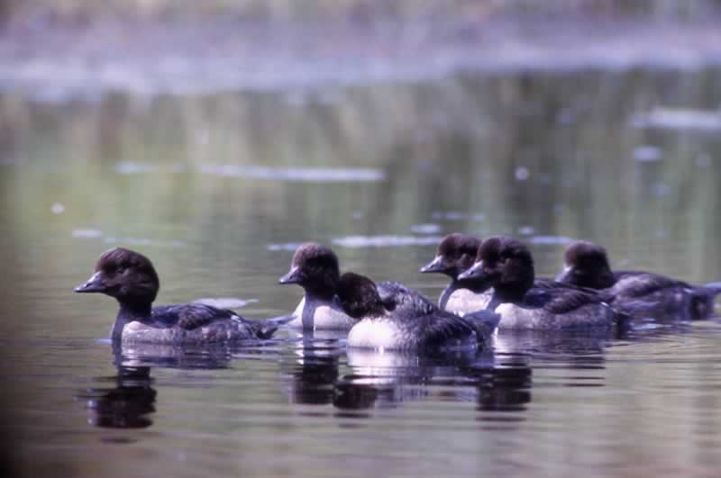 The eggs hatch in 32-34 days. The male leaves before the eggs hatch. The ducklings are precocial and feed themselves shortly after birth. Often, after the ducklings hatch, they join with other groups of ducklings, and a single female takes care of all of the ducklings. The female leaves her young when they are 5-6 weeks old, before they can fly. The ducklings fledge when they are 8-9 weeks old.