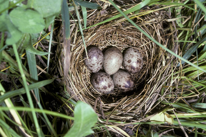 The Bobolink uses grass and sedges to build a nest on the ground. Sometimes, it crafts a canopy out of dead grass over the top of the nest for additional camouflage. The female lays 1-7 bluish-gray eggs, which she incubates for 11-13 days. After hatching, the chicks wait about two weeks before first leaving the nest.
