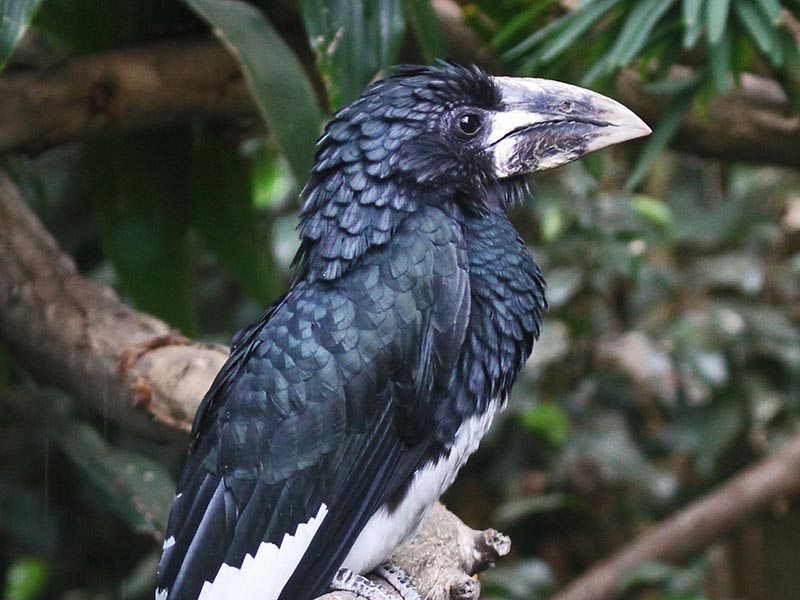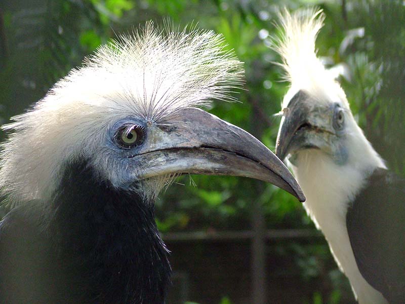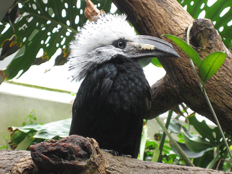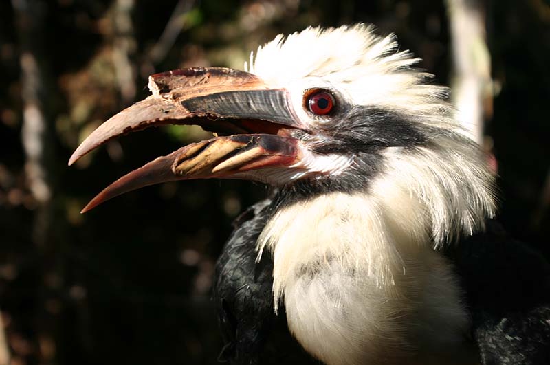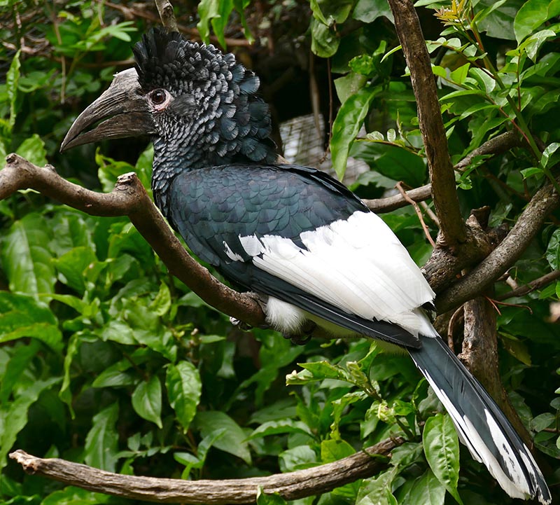 The white-crowned hornbill gets its name for the shaggy crest of white feathers on its head.