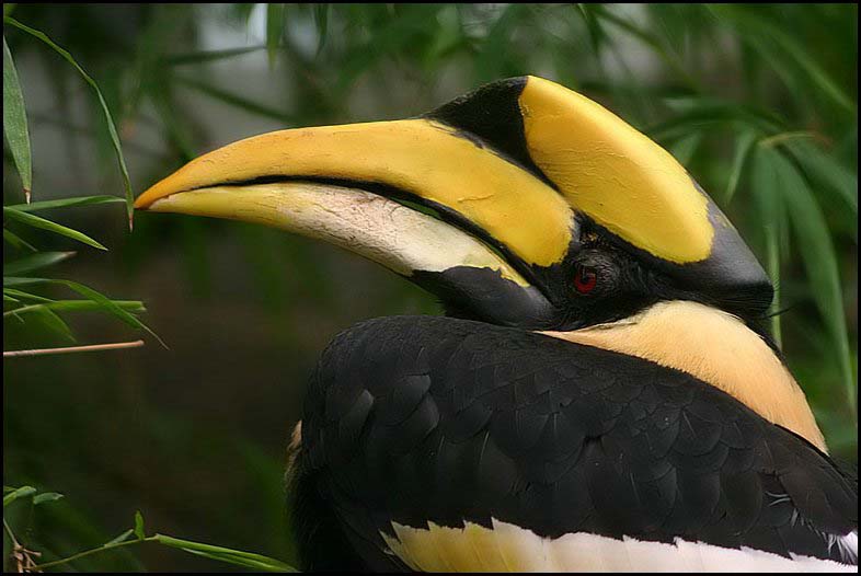 The female great hornbill nests in hollows of large tree trunks. She seals herself in and leaves a narrow opening that the male uses to pass her food.