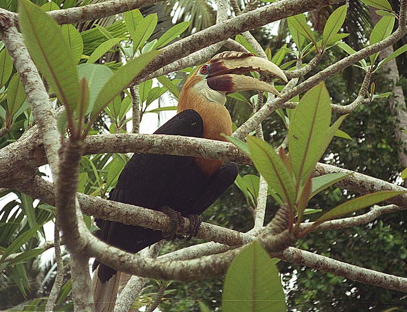 The rufous-necked hornbill gets its name from its rusty-red underparts, neck and head.
