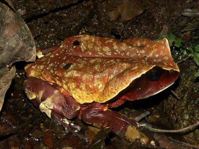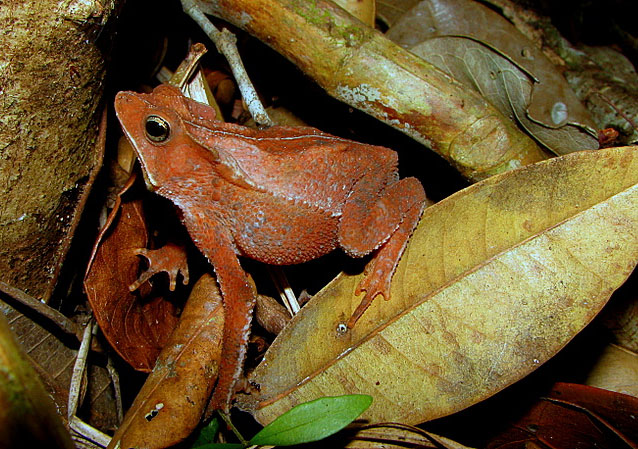 This tiny toad, no bigger than a man's thumbnail, is found in Brunei and Malaysia.