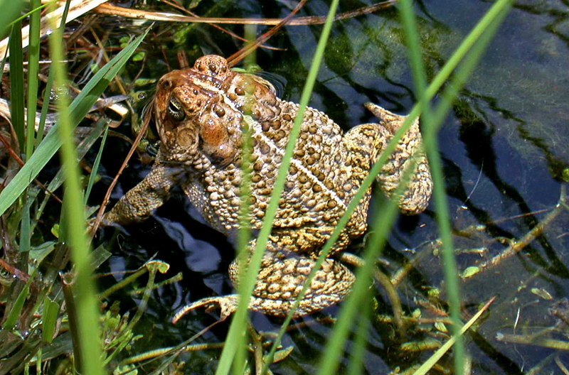 In the spring and the summer, the western toad is usually found at the water's edge or basking on partially submerged logs.