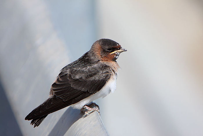 The Cliff Swallow is a small, stocky songbird. It has long, pointed wings that allow the cliff swallow to swoop through the air. Its wings and back are dark while its chest is white. The Cliff Swallow has a red neck and a white patch on the top of its head.