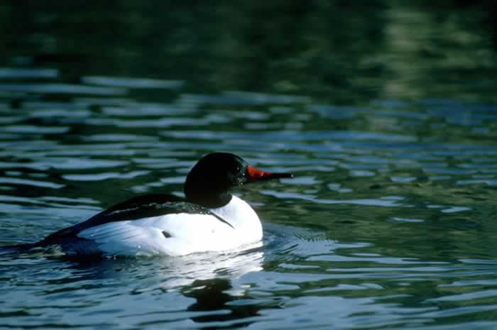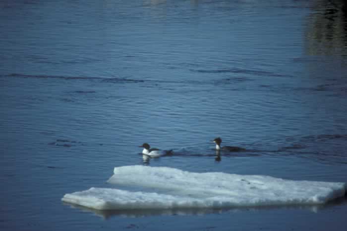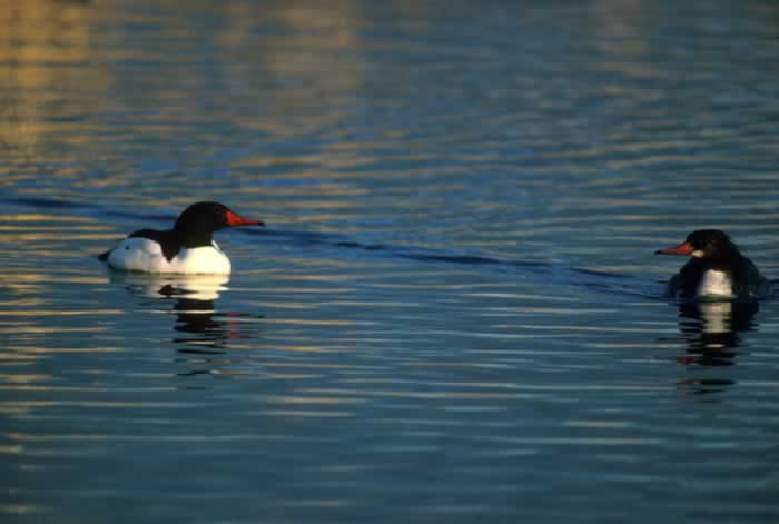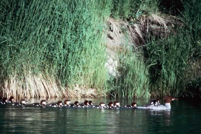 During the breeding season, the common merganser is found on wooded rivers and lakes. It winters on lakes, rivers, bays, and estuaries. | |