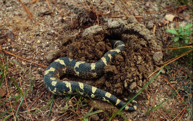 The eastern hognose snake is found in woodlands with sandy soil, fields, farmland, and coastal areas. It is active during the day.