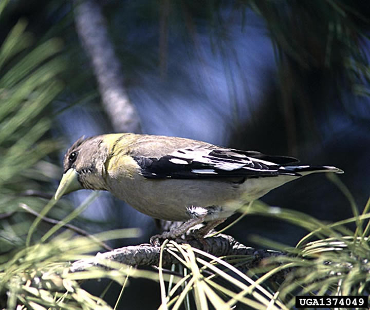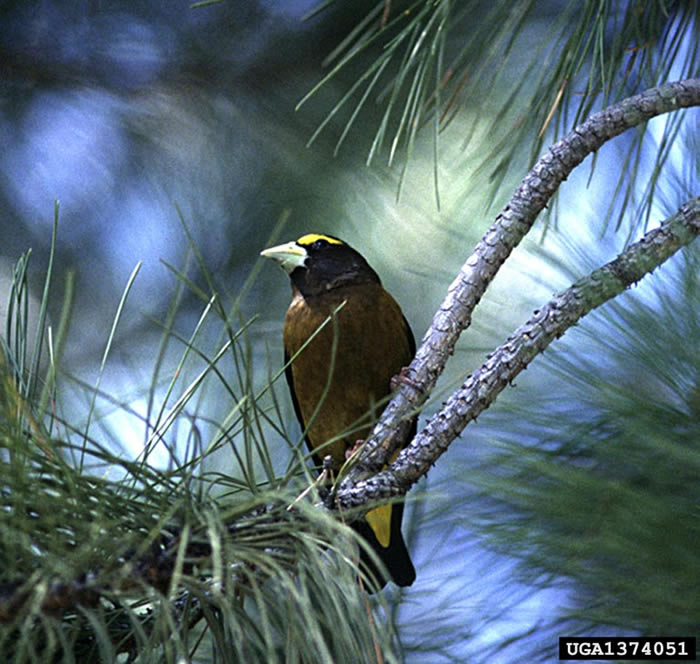 Most of the evening grosbeak's diet is made up of seeds and fruits, but it also eats insects. It prefers the seeds of maple, spruce, pine, fir, and balsam trees.