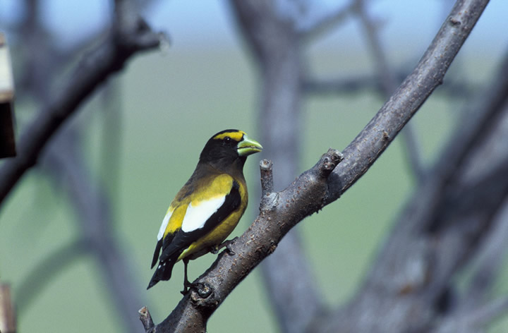The evening grosbeak is a common visitor to bird feeders and is especially fond of sunflower seeds.