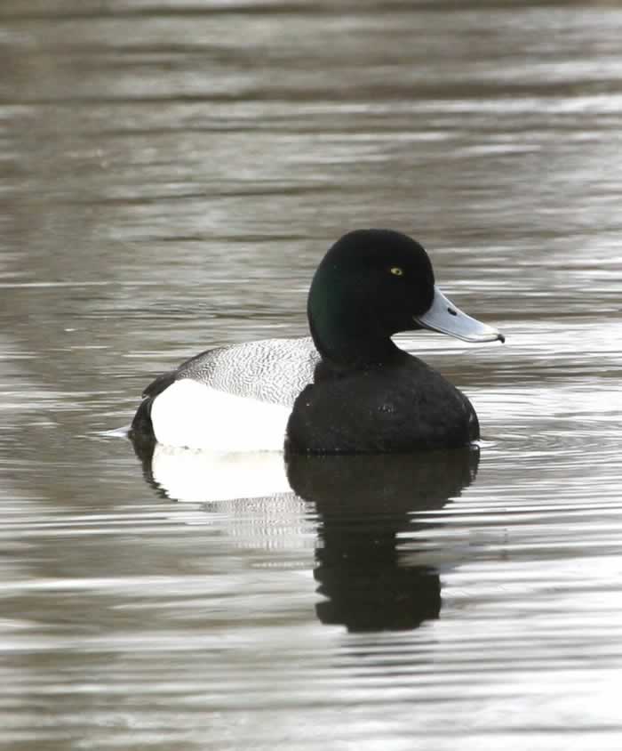 The greater scaup is a medium-sized diving duck. It is 15-22 inches in length with a wingspan of about 28-30 inches. It has a rounded head, bright yellow eyes, and a grayish-blue bill with a black tip. The male has a black chest and tail, white sides, and a barred gray back. His head and neck look black, but they are actually a greenish-black. The female is brown and has a white patch at the base of her bill. Both the male and the female have a white wing stripe and a white belly. The greater scaup looks very similar to the lesser scaup.