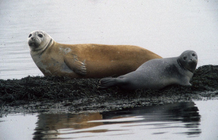 The male harbor seal is about 5-6 feet in length and weighs 200-375 pounds. The female is 4.5-5 feet in length and weighs 110-330 pounds. The harbor seal can vary in color from white, light gray, or yellowish gray with dark spots to black, gray, or brown with light rings or spots. Its fur is
