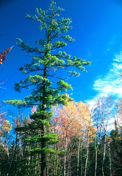 The white pine is the largest conifer in the Northeast. It has a straight trunk with a crown of horizontal branches. It can grow to be 100 feet tall and its trunk can have a diameter of 3-4 feet. It has slender, greenish-blue needles that are 2.5-5 inches long that grow in bundles of five. It has long, narrow yellowish-brown cones 6-8 inches long. The bark of the white pine is smooth and gray when the tree is young. It becomes gray-brown and deeply furrowed as the tree ages. The white pine can live to be 400 years old.