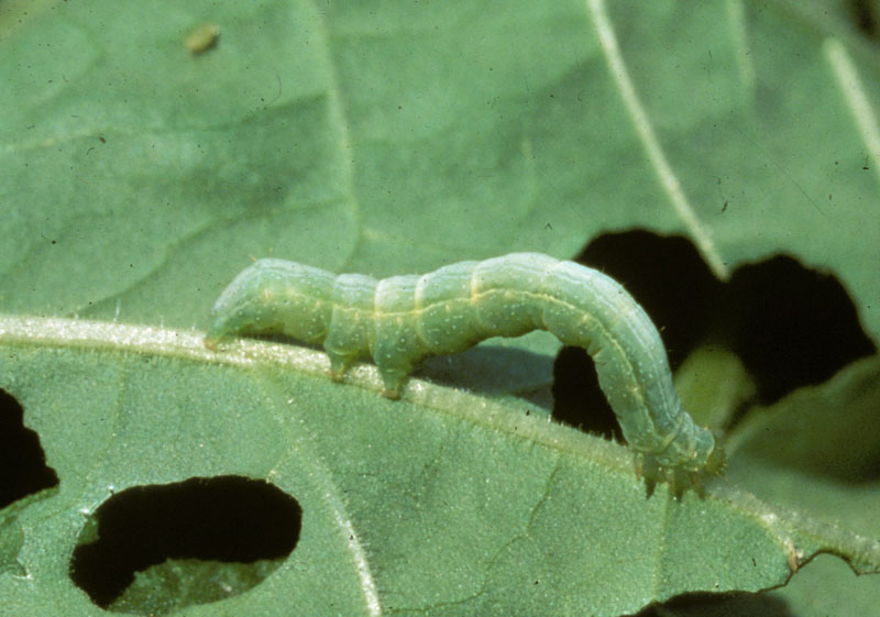Armyworms and cabbage loopers are also in this family and can cause damage to crops. Cabbage loopers are also known as cabbage worms. They are called loopers because they hunch their bodies and move like inch worms. They are pale green with white stripes and feed on crops like cabbage, kale, turnips, broccoli, and cauliflower.