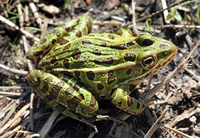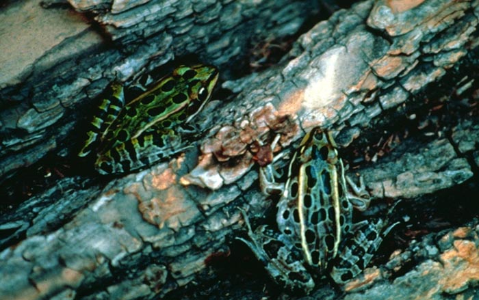 The northern leopard frog is sometimes confused with the pickerel frog. The pickerel frog looks similar, but its spots are square and arranged in rows, and it has patches of bright yellow or orange skin on the inside of its thighs.