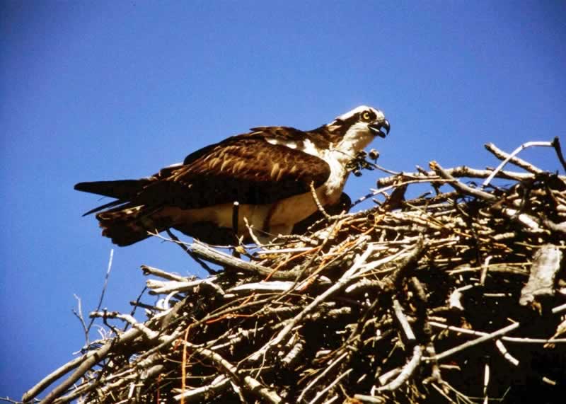 | Project Osprey is based on the "if you build it, they will come" principle. Workers erect phone poles in desirable osprey habitat near prime fishing waters, and construct platforms and partial nests at the top. The human-made nesting platforms give the ospreys a head start, encouraging young ones to set up in unclaimed territory. The platforms also give wildlife scientists, like Chris Martin of Audubon, a chance to tag the birds and do research. Researchers put up metal guards around nesting poles and trees to discourage nest-robbing by predators. Osprey return to New Hampshire from southern wintering grounds each spring to breed near rivers, lakes, and estuaries where they hunt for fish. Recovery efforts have already helped the birds to expand their breeding range; roughly two dozen pairs of osprey have nested and raised young in four different New Hampshire watersheds -- Androscoggin, Merrimack, Connecticut and Great Bay -- in the last few years. Key Concepts