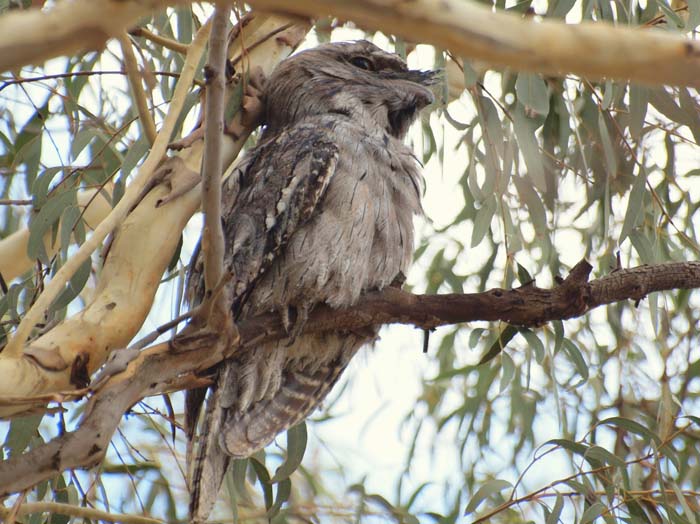 During the day tawny frogmouths sleep perched lengthwise on a branch with their heads up and their eyes closed.