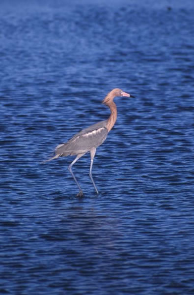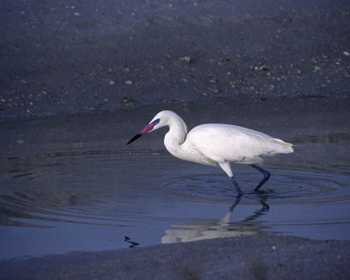HabitatThe reddish egret is found in areas with salty or brackish water. Habitats include coastal tidal flats, salt marshes, and lagoons. DietWhen the reddish egret hunts for food, it races back and forth in the shallow water, often spreading its wings wide and flapping them. It eats fish, frogs, and crustaceans. Sometimes it curves its wings forward around its body and makes a canopy that casts shade on the water. When prey swims towards the shady spot, the reddish egret quickly snatches it up. Life Cycle