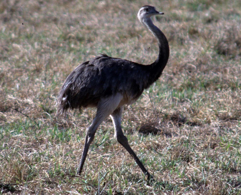 Rheas eat leaves, roots, seeds, grass, insects, and small mammals, reptiles, and amphibians. Rheas have long necks; long, powerful legs; and shaggy gray feathers.