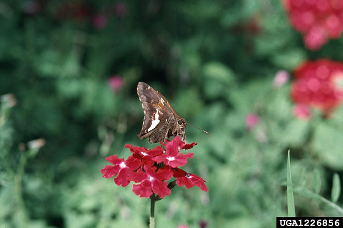 The silver-spotted skipper has a wingspan of 1.5 to 2.5 inches. It has sharply-pointed, triangular forewings. It is dark brown on its uppersides and undersides. It has a yellow band on the upperside and the underside of its forewings. It gets its name from the large silvery spot on its hindwings.