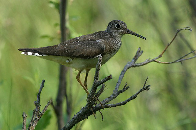 DietThe solitary sandpiper forages in shallow water and skims food up from the surface of the water. It eats insects, larvae, small fish, tadpoles, frogs, spiders, and worms. It often shakes its foot to stir prey up to the surface of the water. Occasionally, it probes in the water for food, and it also forages for food on land. Life CycleThe male selects the nesting site. He chooses an abandoned nest of songbirds like American robins, rusty blackbirds, eastern kingbirds, gray jays or cedar waxwings. The nest is usually in a conifer tree, sometimes as high as 40 feet above the ground. The female may rearrange the nest after the male selects it. She lays 3-5 eggs. Both parents incubate the eggs for 23-24 days. The chicks are precocial and leap from the nest shortly after hatching. BehaviorThe solitary sandpiper and the green sandpiper of Eurasia are the only species of sandpipers that nest in trees! |