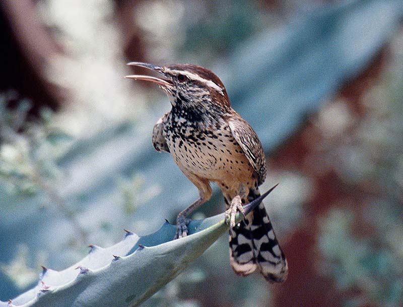 The female cactus wren often builds her nest in a cholla cactus.