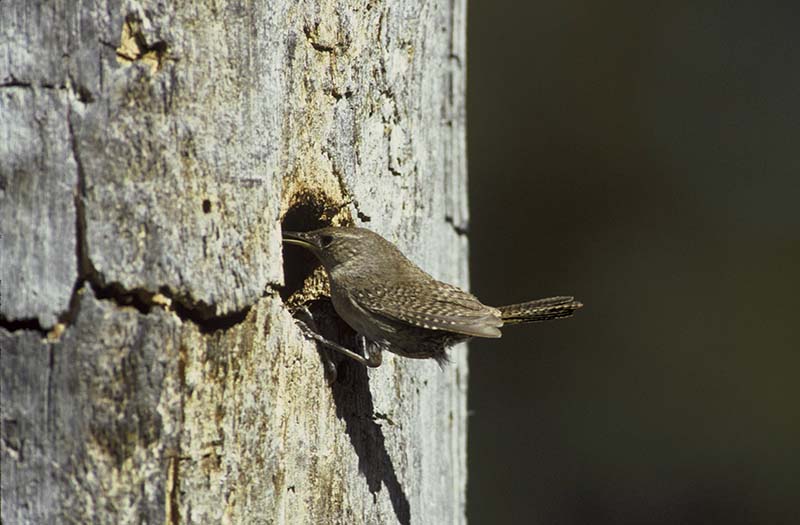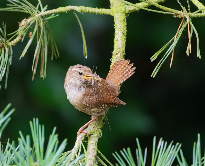 The winter wren forages for insects in dense underbrush.