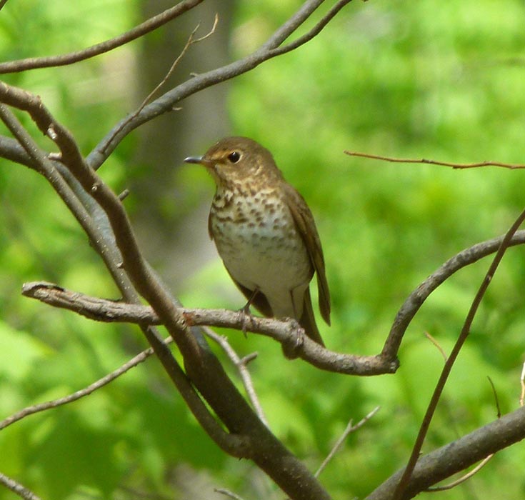 It has a clear and recognizable song that is particularly easy to hear cascading through the woods during breeding season. RangeThe veery is migratory and has a very large range. During breeding season, it lives along the border between Canada and the United States from British Columbia to Maine and Nova Scotia. From southern Canada, the veery's range dips south into the Rocky Mountains, along the Great Lakes, along the Appalacian Mountains and throughout New England. In the fall, the veery migrates to central and southern Brazil. HabitatThe veery spends the summer in spots along rivers in damp, deciduous forests. Distrurbed forests with a dense understory are preferred. |